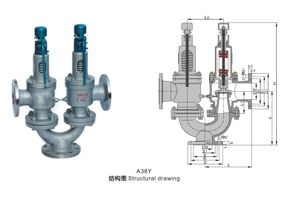 Type A38Y, A43H, and A37H double safety valves are constructed by installing two A48Y or A47H safety valves of the same specification on the Y-joint. The nominal diameter series refers to the inlet diameter of the Y-joint. The combination of these two safety valves is as follows: