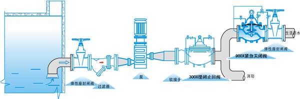 900X emergency shutoff valve is used in the parallel water supply system of domestic water supply and fire water supply. It is normally used for domestic water supply. When the fire occurs, the valve automatically closes the domestic water to ensure sufficient water for fire protection. When the fire fighting stops using water, the pressure decreases and the valve automatically restores the domestic water. The valve makes the system need not set up a special fire fighting separate water supply network, thus greatly saving the construction cost and daily water consumption. The valve is sensitive, safe, reliable, easy to debug and long service life.